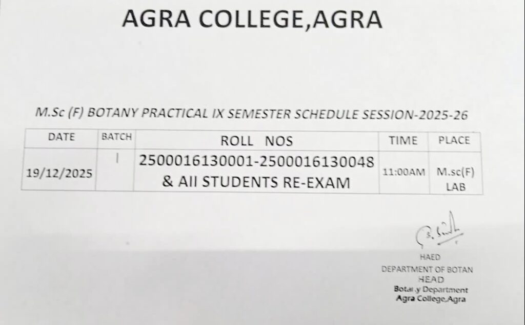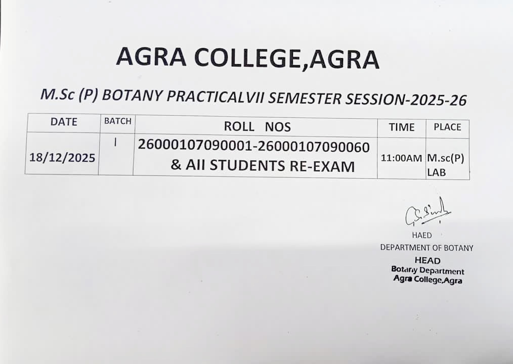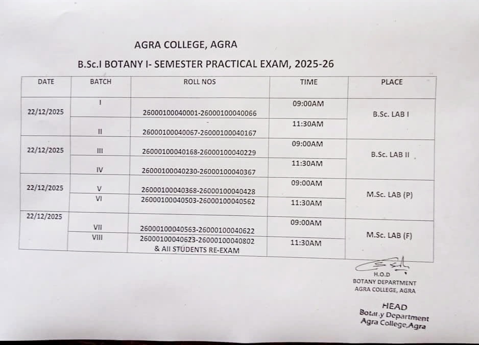 आगरा। आगरा कॉलेज के प्राचार्य प्रोफेसर सी. के. गौतम ने सत्र 2025–26 के स्नातक (UG) और स्नातकोत्तर (PG) पाठ्यक्रमों की प्रायोगिक परीक्षाओं (Practical Exams) की घोषणा कर दी है। कॉलेज प्रशासन ने ड्राइंग एंड पेंटिंग, जूलॉजी और बॉटनी विभागों के लिए विस्तृत दिशा-निर्देश जारी किए हैं, ताकि शैक्षणिक गतिविधियां सुचारू रूप से संपन्न हो सकें।