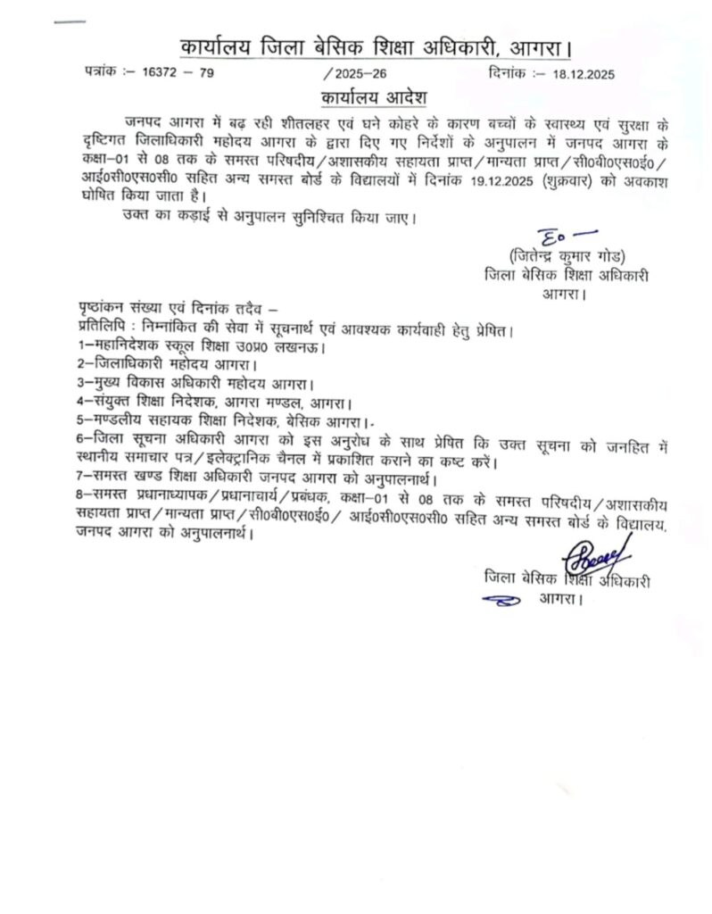 बेसिक शिक्षा अधिकारी (BSA) जितेंद्र कुमार गौण द्वारा जारी आदेश के अनुसार, जनपद आगरा के समस्त शासकीय, अशासकीय, सहायता प्राप्त और निजी (प्राइवेट) विद्यालय 19 दिसंबर को बंद रहेंगे। यह आदेश कक्षा 1 से 8 तक के सभी छात्रों पर लागू होगा। प्रशासन ने साफ किया है कि सुबह के समय घने कोहरे और गिरते तापमान के कारण छोटे बच्चों को स्कूल जाने में होने वाली परेशानियों को देखते हुए यह कदम उठाया गया है।